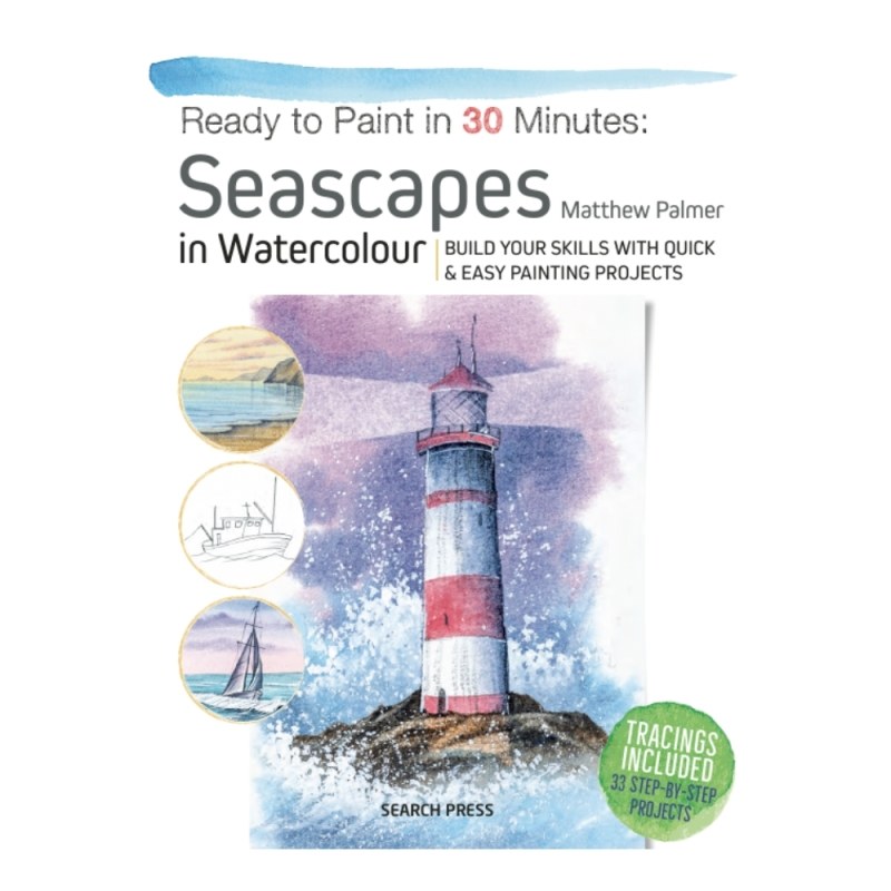 9781800921047This beginner’s course in watercolour contains a series of 33 ocean-themed painting projects, each designed to take 30 minutes or fewer, and structured to build up your skills gradually. Start simple with still water and rippling tides, then move on to creating crashing waves, coastal buildings, boats and sun-bleached sand.